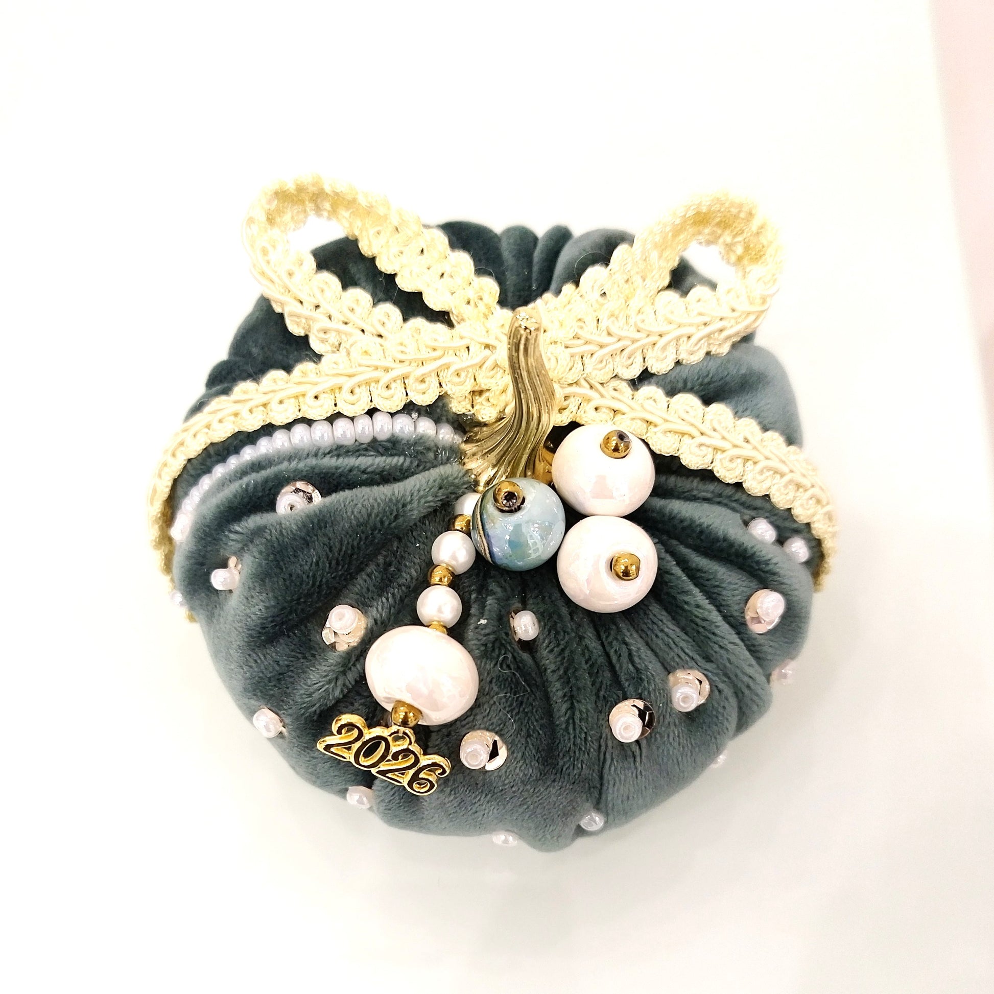 Χριστουγεννιάτικη βελούδινη κολοκύθα σε πράσινο κυπαρισσί χρώμα , στολισμένη με εντυπωσιακά διακοσμητικά , πέρλες , κεραμικές χάντρες και κορδέλες. Ειδικά σχεδιασμένο για διακόσμηση σπιτιού και ως δώρο για καλή τύχη !