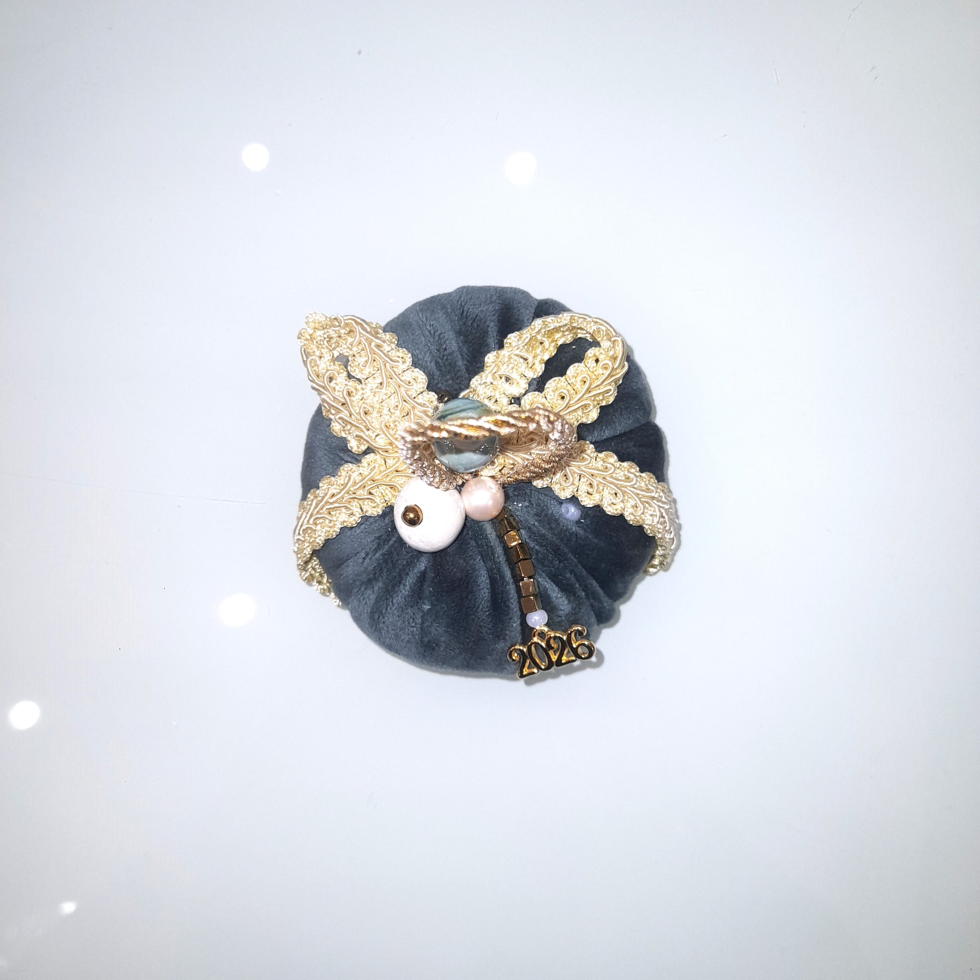 Χριστουγεννιάτικη κρεμαστή βελούδινη κολοκύθα σε κυπαρισσί χρώμα σε μικρό μέγεθος , στολισμένη με εντυπωσιακά διακοσμητικά , πέρλες , κεραμικές χάντρες και κορδέλες. Ειδικά σχεδιασμένο για διακόσμηση σπιτιού , και ως δώρο για καλή τύχη !