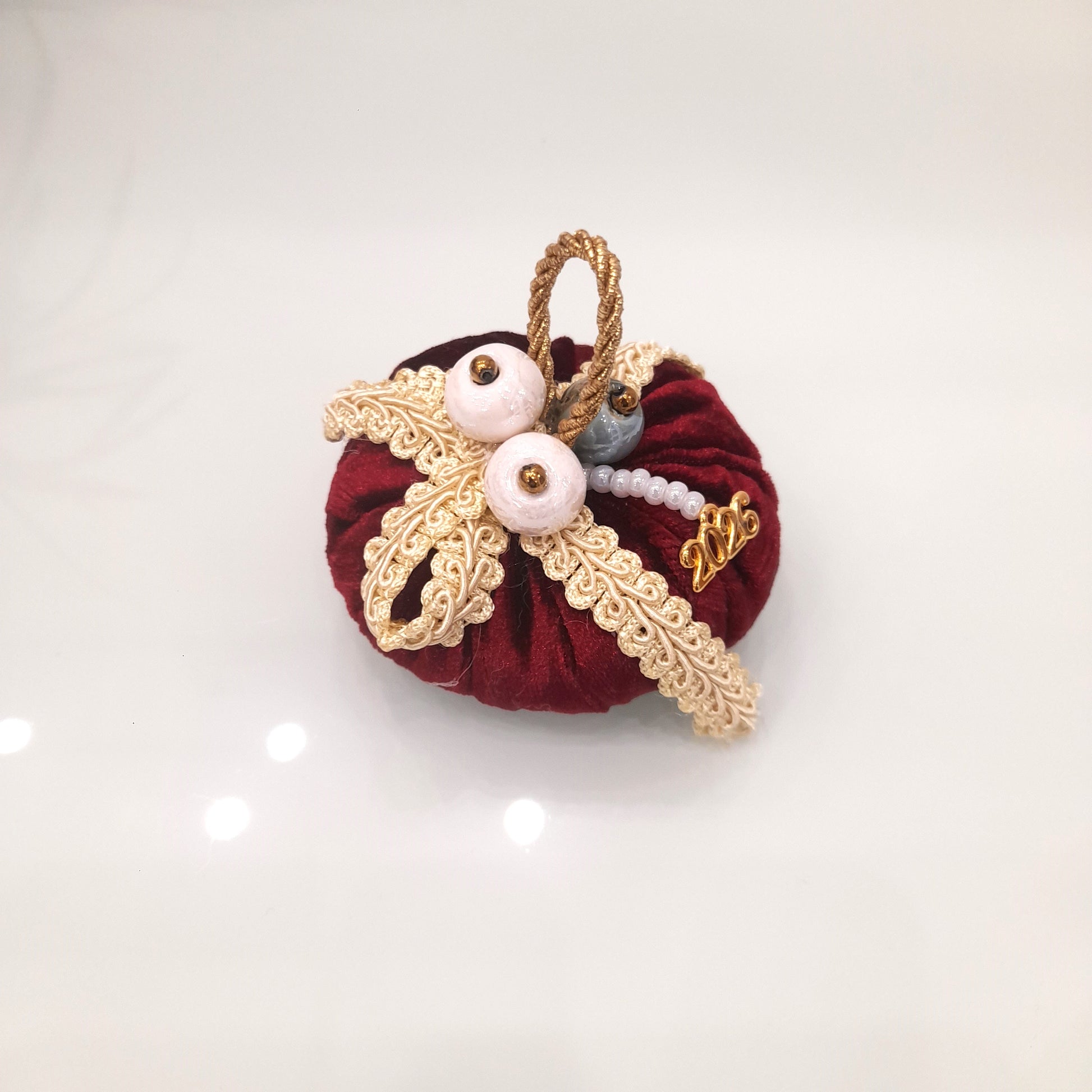 Χριστουγεννιάτικη κρεμαστή βελούδινη κολοκύθα σε μπορντό χρώμα σε μικρό μέγεθος , στολισμένη με εντυπωσιακά διακοσμητικά , πέρλες , κεραμικές χάντρες και κορδέλες. Ειδικά σχεδιασμένο για διακόσμηση σπιτιού , και ως δώρο για καλή τύχη !